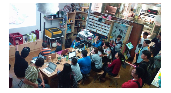 “獨(dú)樂(lè)樂(lè)不如眾樂(lè)樂(lè)”,一個(gè)人閉門(mén)造車(chē)幾個(gè)月才能完成的作品,如果依靠大家共同出謀獻(xiàn)策,也許一個(gè)月就可以完成。正如柴火空間的“共進(jìn)社”,每周三晚上,來(lái)自各行各業(yè)的創(chuàng)客會(huì)員們(有工程師、設(shè)計(jì)師、中學(xué)生、大學(xué)生,以及DIY愛(ài)好者)聚集在這里,共同完成一些創(chuàng)意。“互動(dòng)沙盤(pán)”是柴火創(chuàng)客空間參加2016年深圳國(guó)際文化博覽會(huì)的展品之一,就是由會(huì)員們?cè)诓窕鸬膭?chuàng)客導(dǎo)師協(xié)調(diào)下,共同完成的。與創(chuàng)客空間的培養(yǎng)模式相比,企業(yè)的創(chuàng)客培養(yǎng)固然有所不同,但這種創(chuàng)客特質(zhì)應(yīng)當(dāng)是一脈相承的。