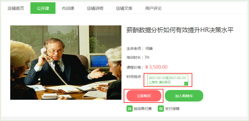 2、進(jìn)入課程詳情頁面,選擇課程時間地點,再點擊立即購買,如下圖