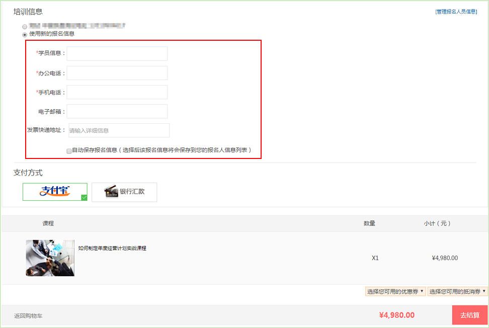 4、點擊填寫并確認(rèn)訂單,進(jìn)入以下頁面,將學(xué)員姓名、電話、手機(jī)填寫完整。