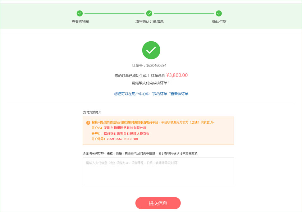 5、點擊下單完成并支付,進(jìn)入支付頁面,通過線下支付和線上銀行支付都可以;如選擇銀行匯款方式,點擊確認(rèn)支付。將采購ID、轉(zhuǎn)賬賬 號、課程名稱、金額、時間輸入支付信息里,點擊提交信息即可。